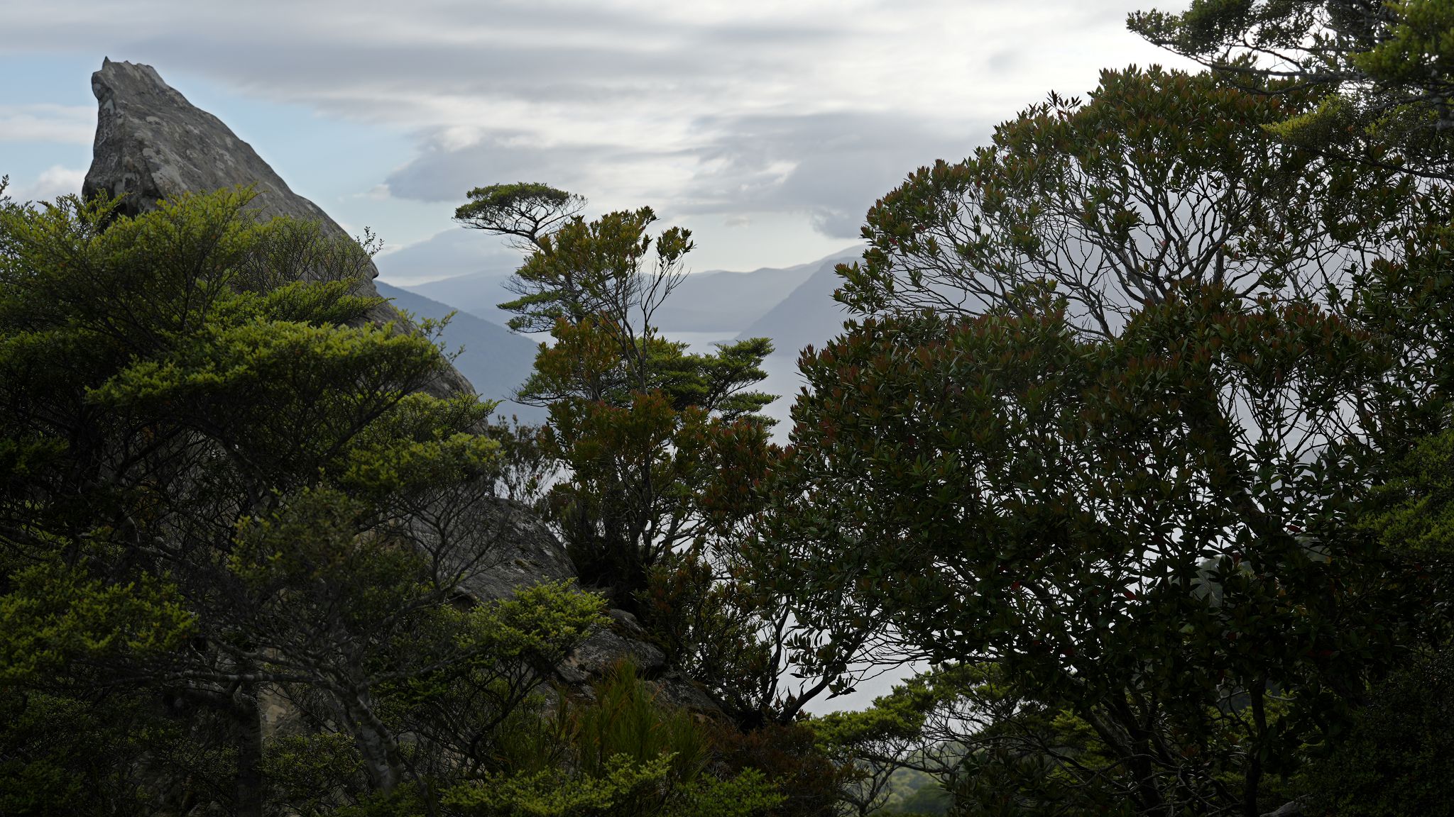 Garden Mound Track: Little Beach. Old-growth rimu trees, rare near Oban. Ditto. Mount Anglem from top of Garden Mound (162m).