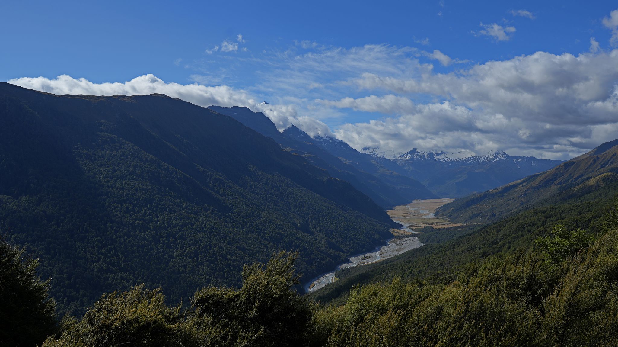 Down valley, Mount Earnslaw, up valley.