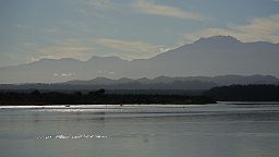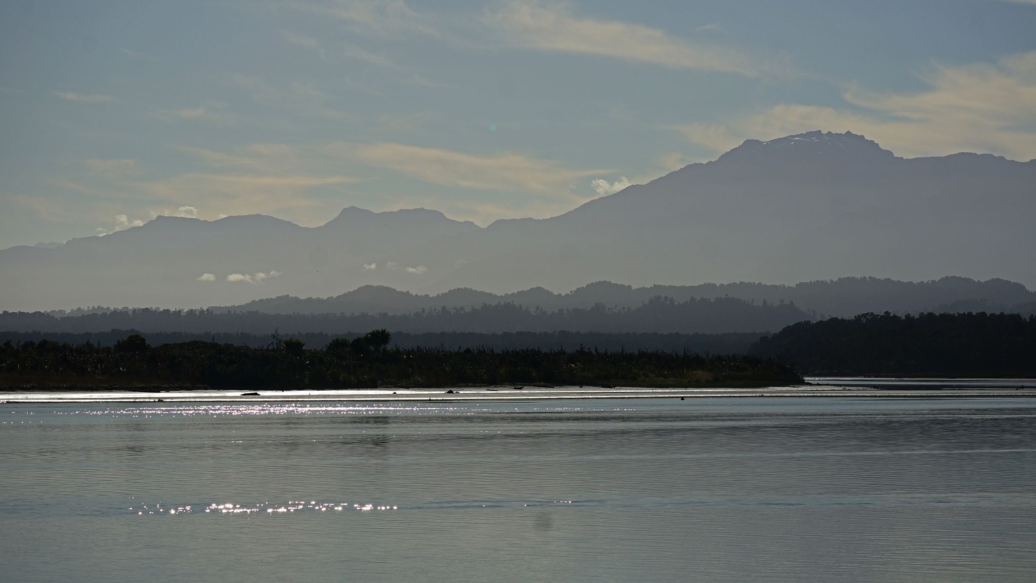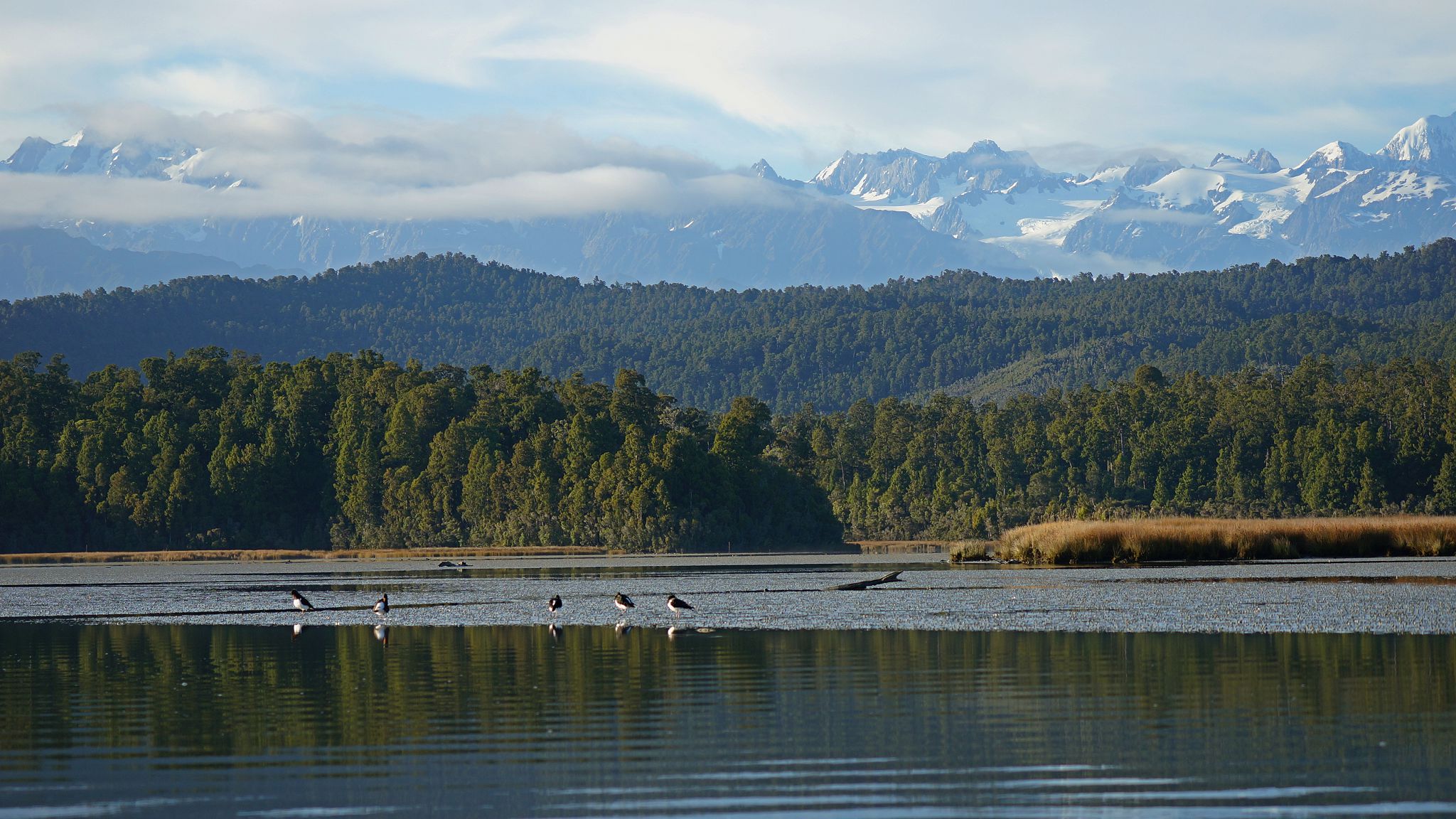Lagoon: from kayak, pied oystercatcher, white heron, Alps.