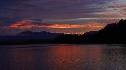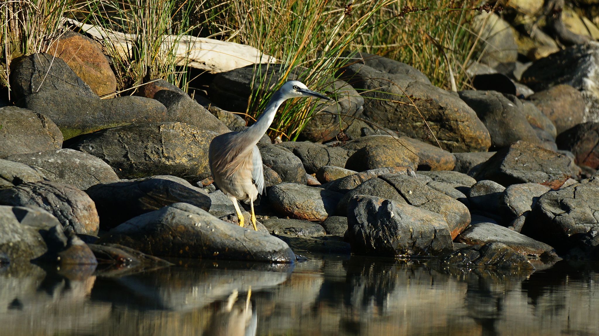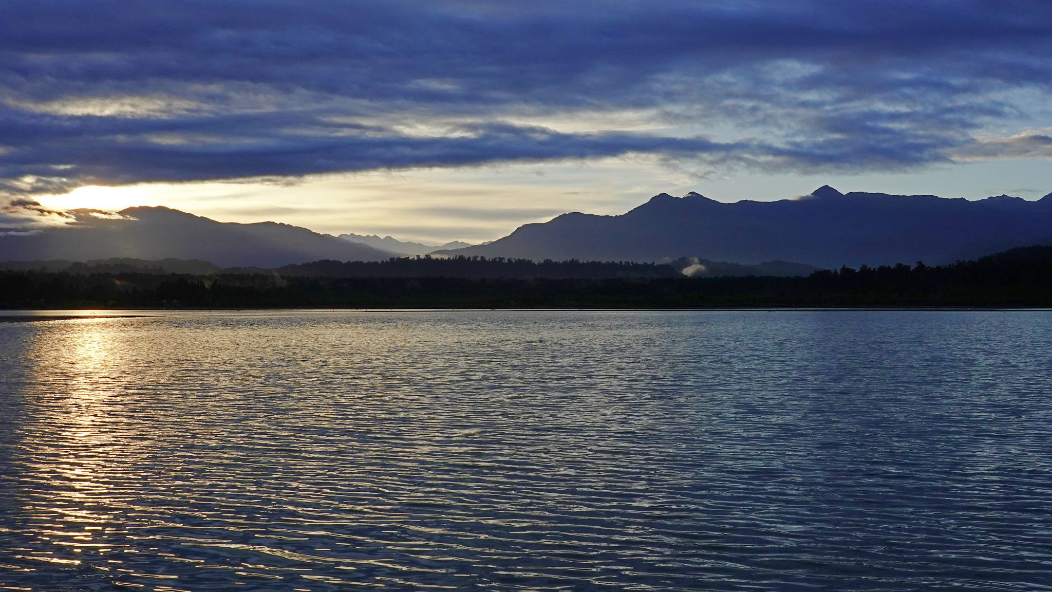Lagoon: sunrise, sunrise, daybreak, daybreak, morning (Tasman and Cook at top right; White-faced Heron, kayak in foreground).