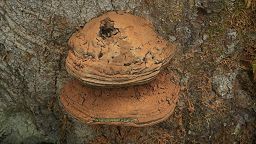 descent of track in morning fog; Coriolus versicolor.