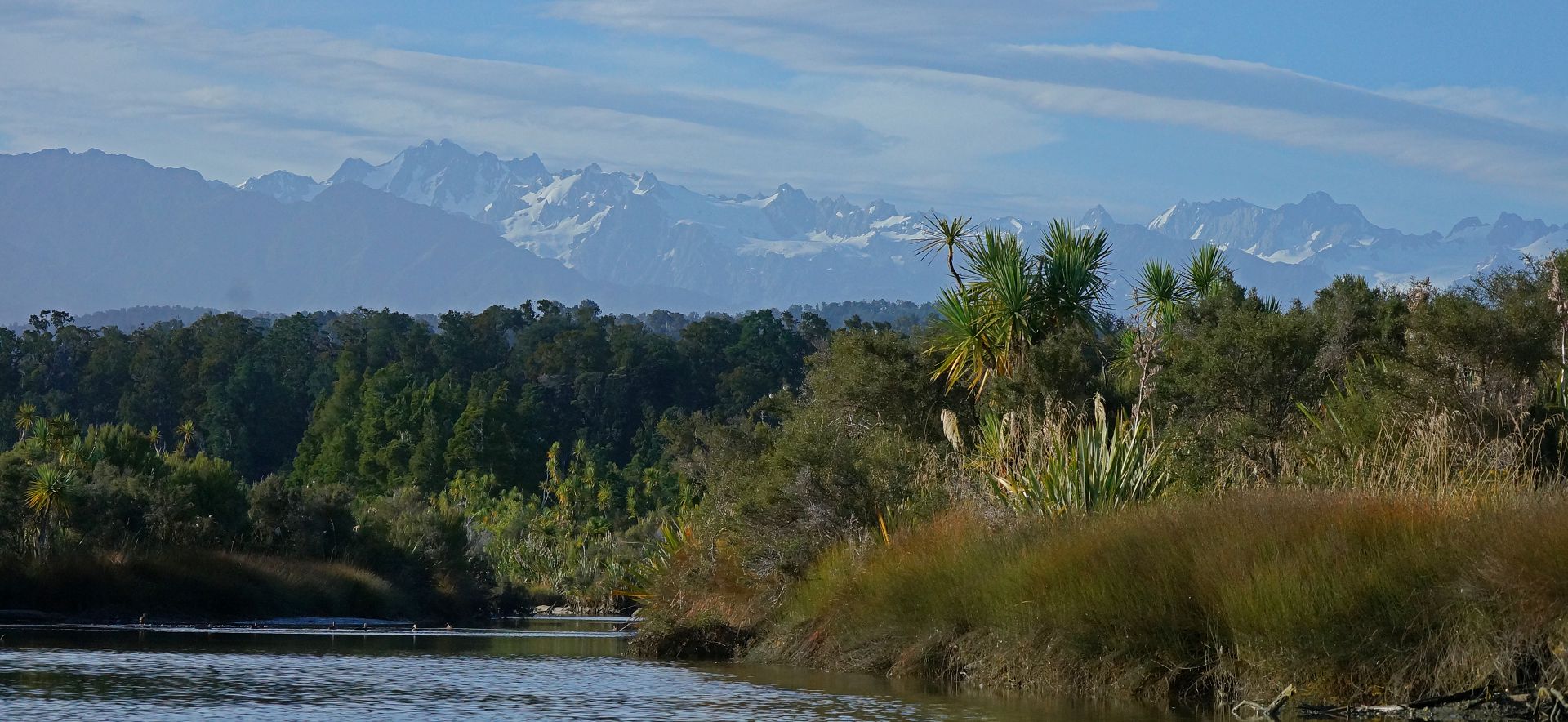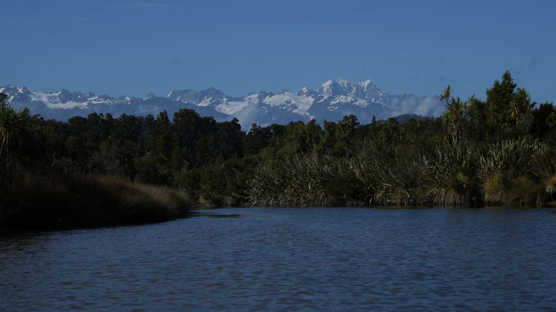 Okarito Lagoon (Okarito Delta) 1. Early morning start. 2. Okarito delta. 3. Okarito river. 4. Okarito lagoon and alps. 5. Tasman and Cook.