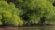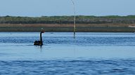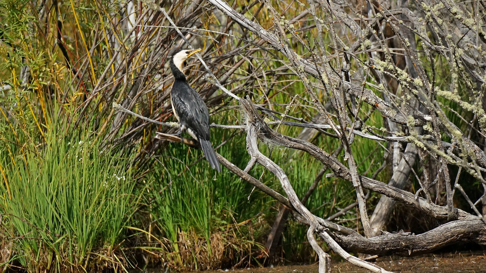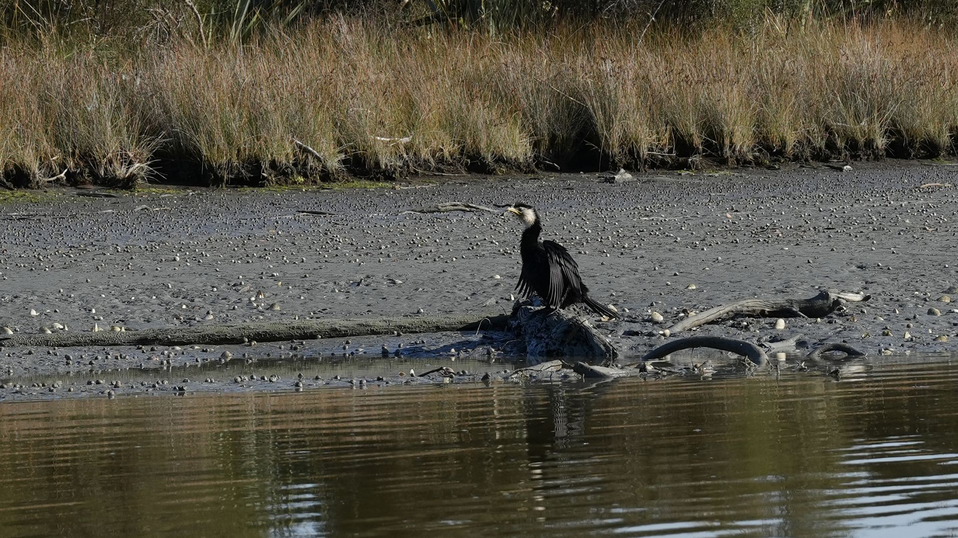 Okarito Lagoon (Okarito Delta). 1. Black shag. 2. Okarito delta and trail marker.