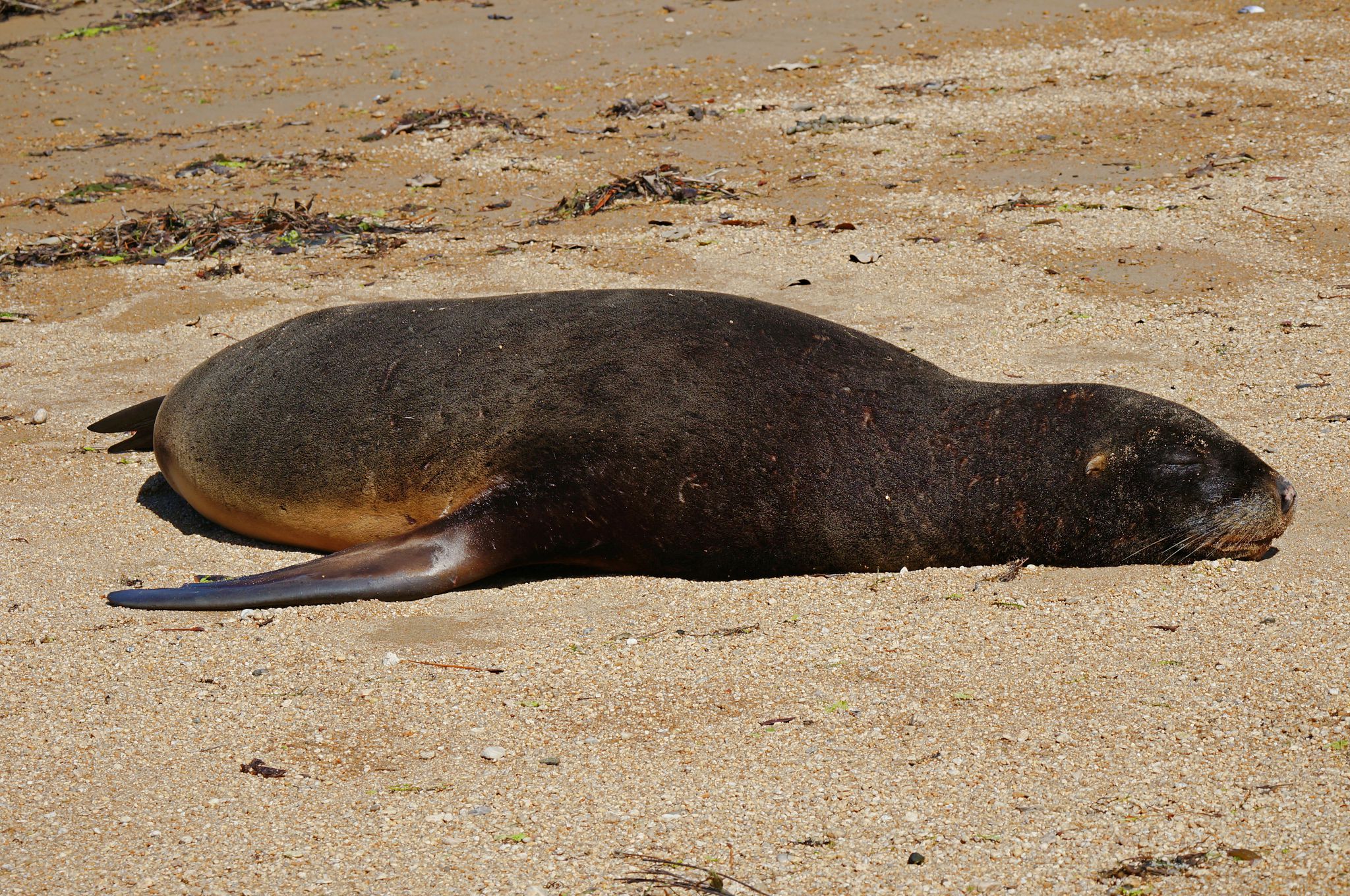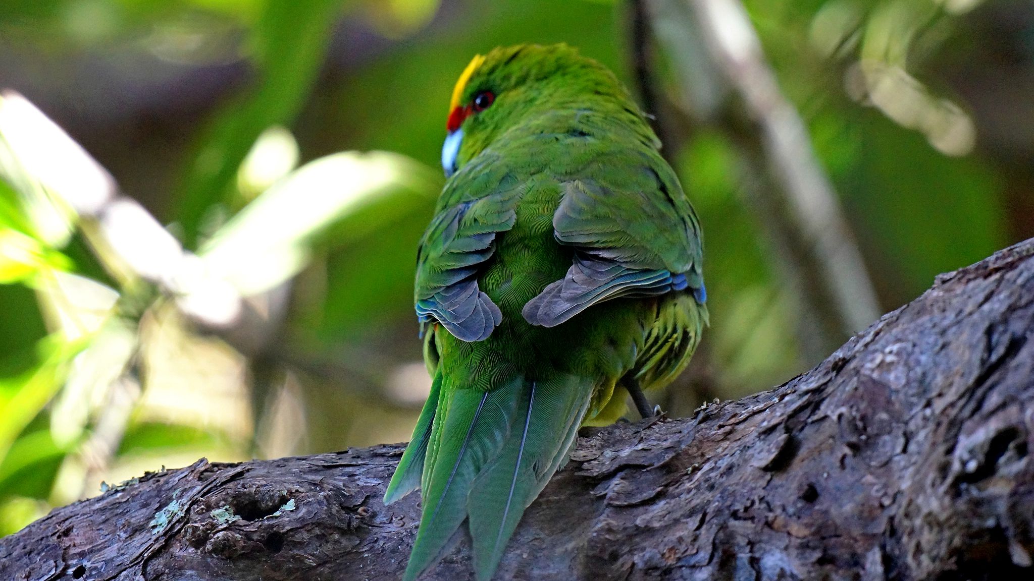 Ulva Island: West End Beach; Sea lion snoozing; Yellow-crowned parakeet.