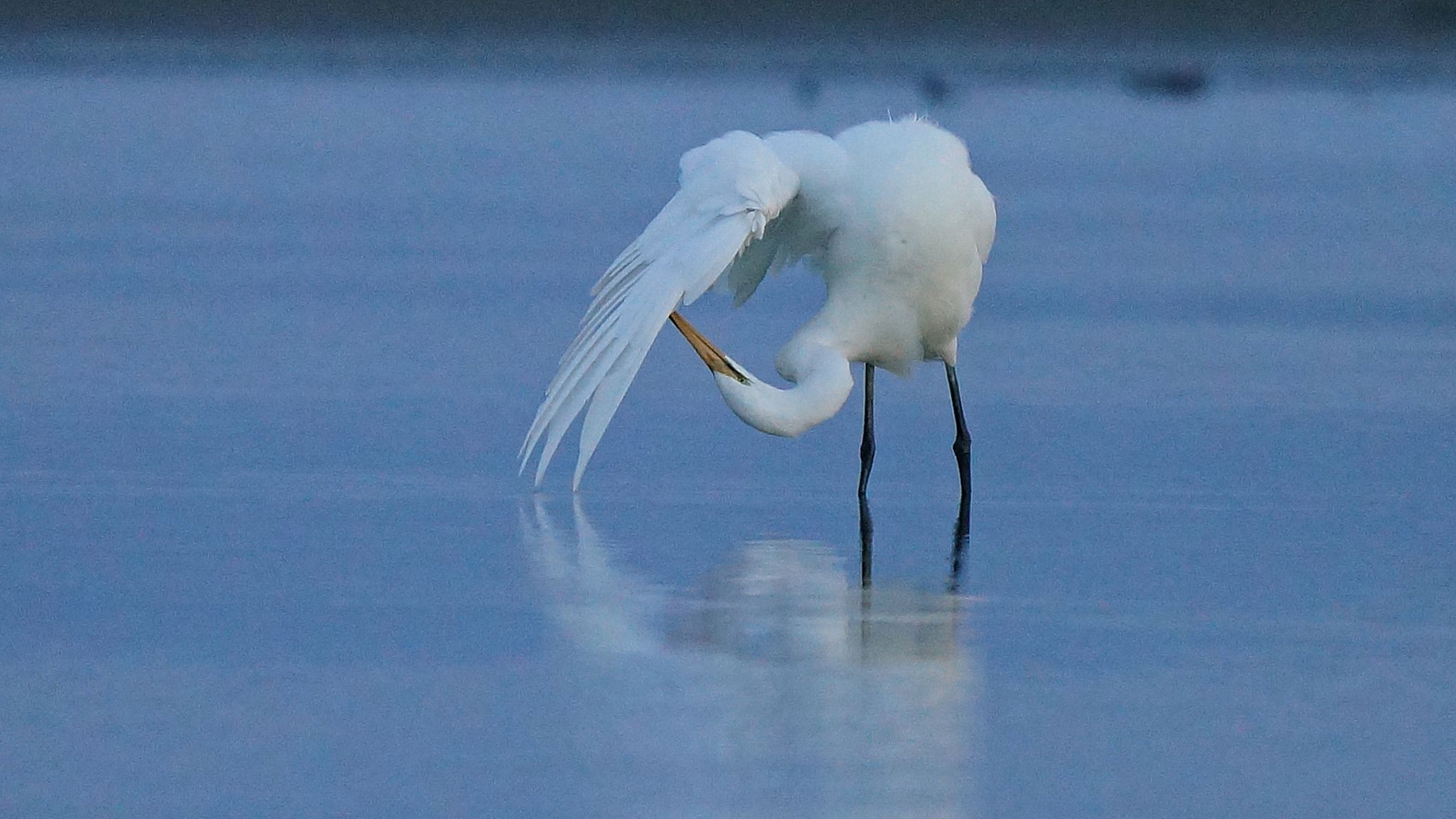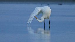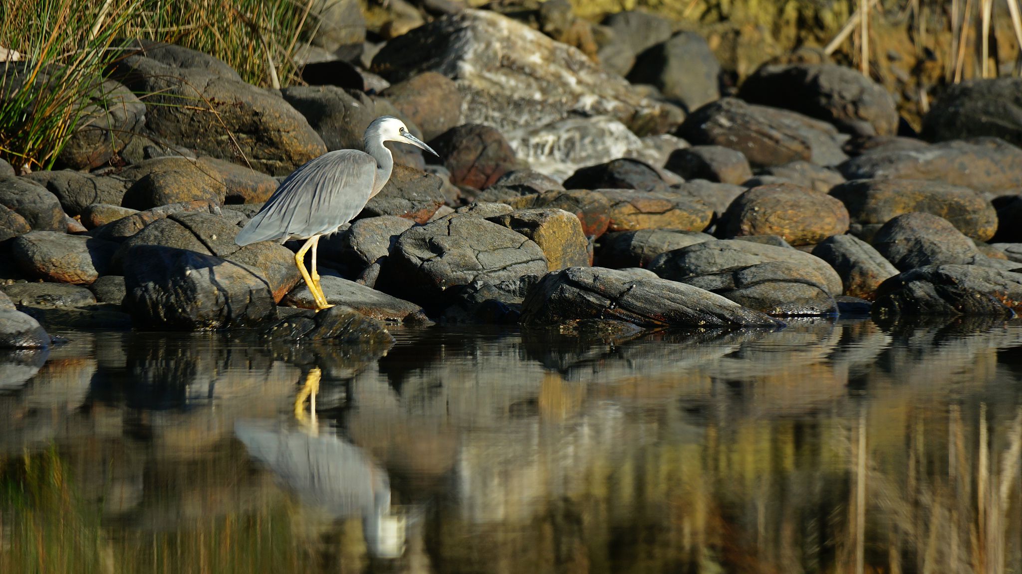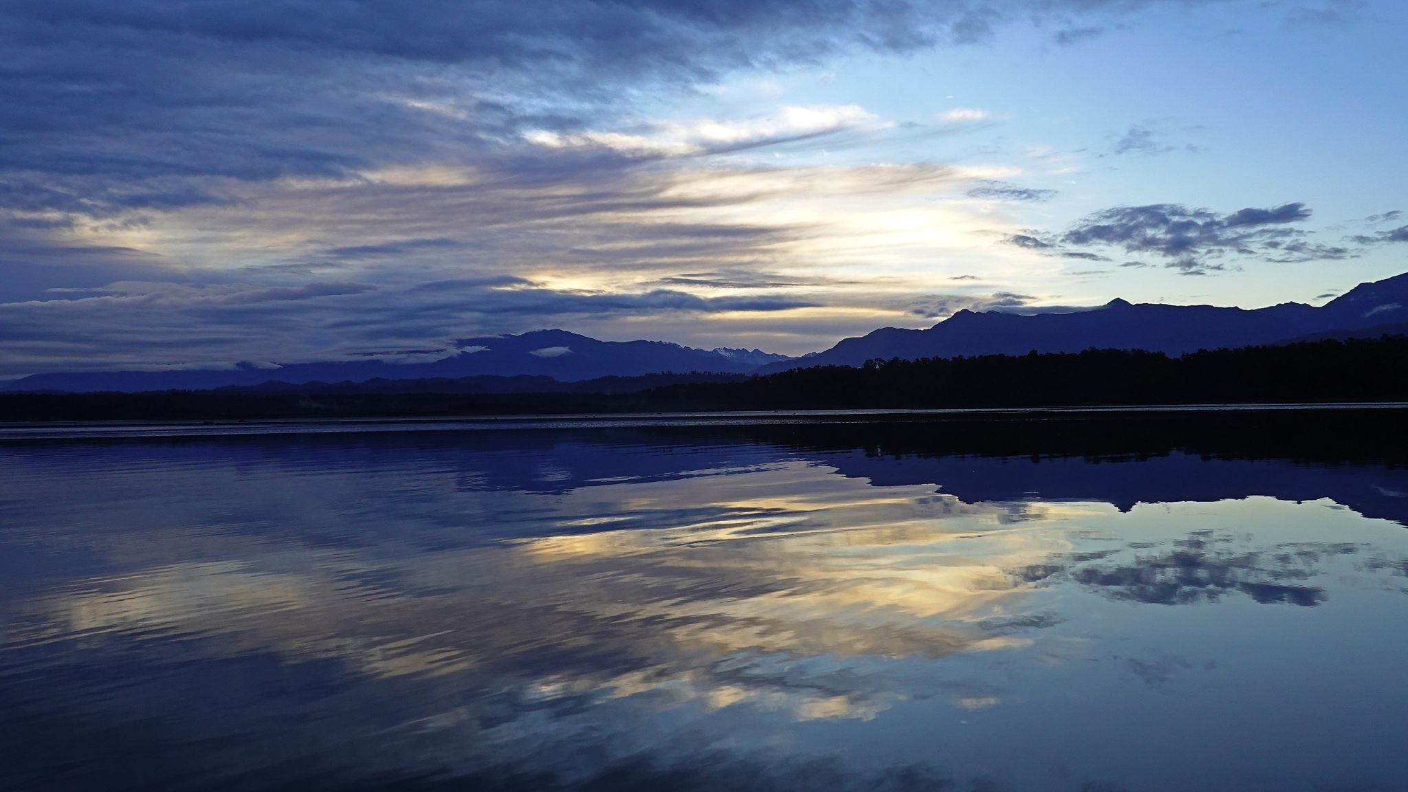 Lagoon: sunrise, sunrise, daybreak, daybreak, morning (Tasman and Cook at top right; White-faced Heron, kayak in foreground).