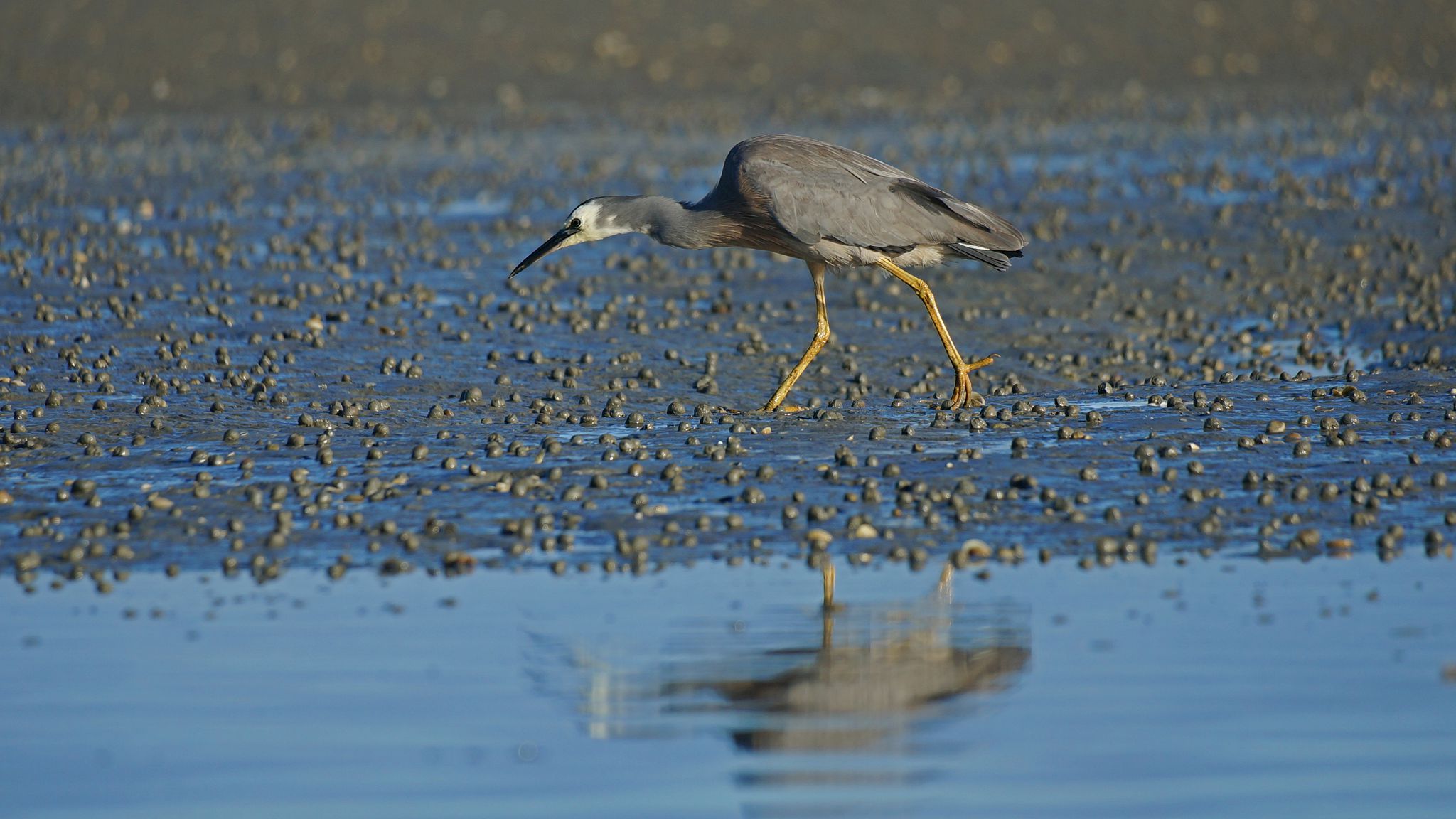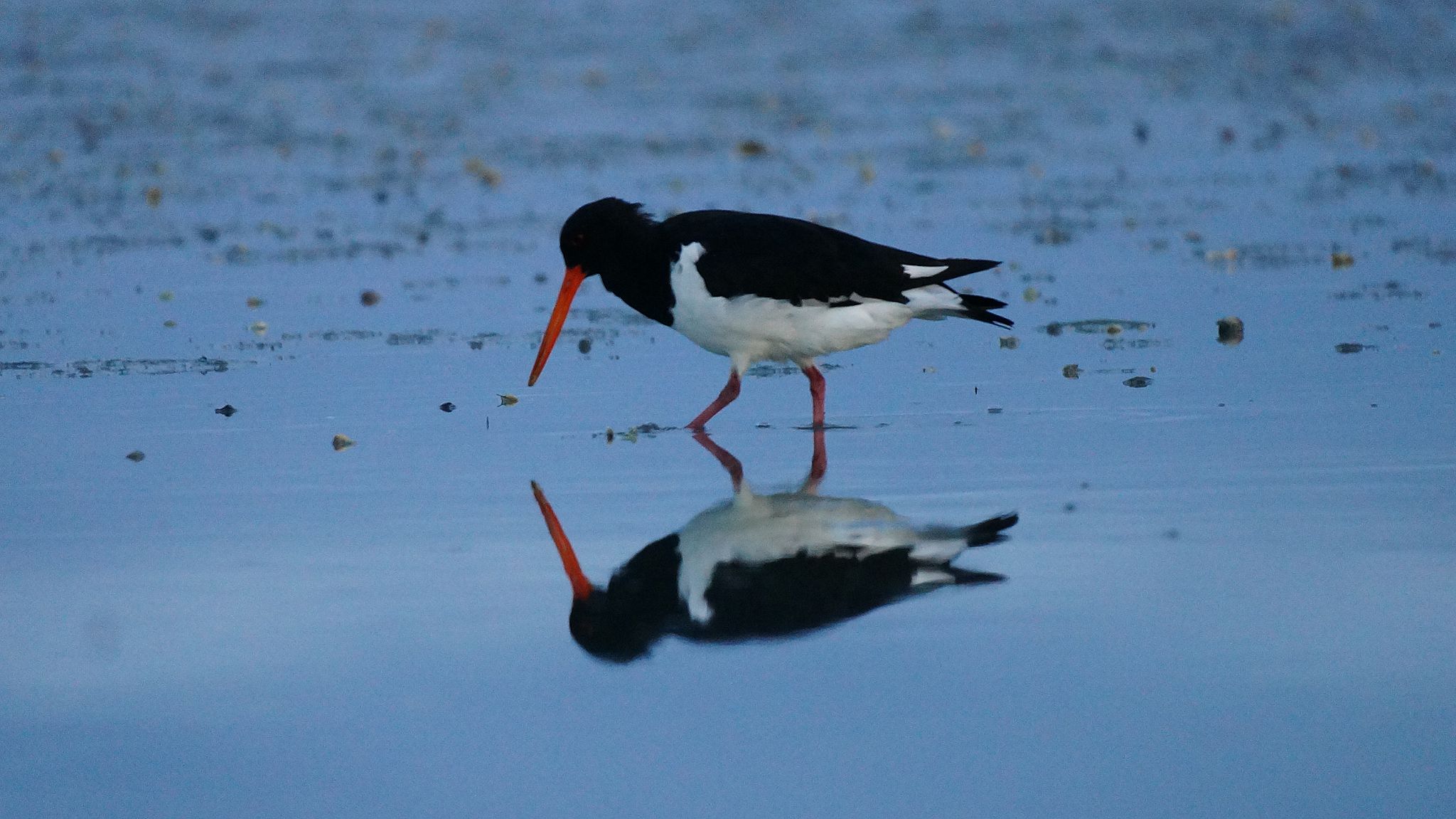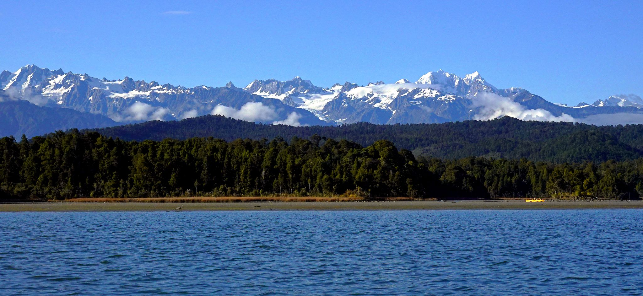 Lagoon: from kayak, pied oystercatcher, white heron, Alps.