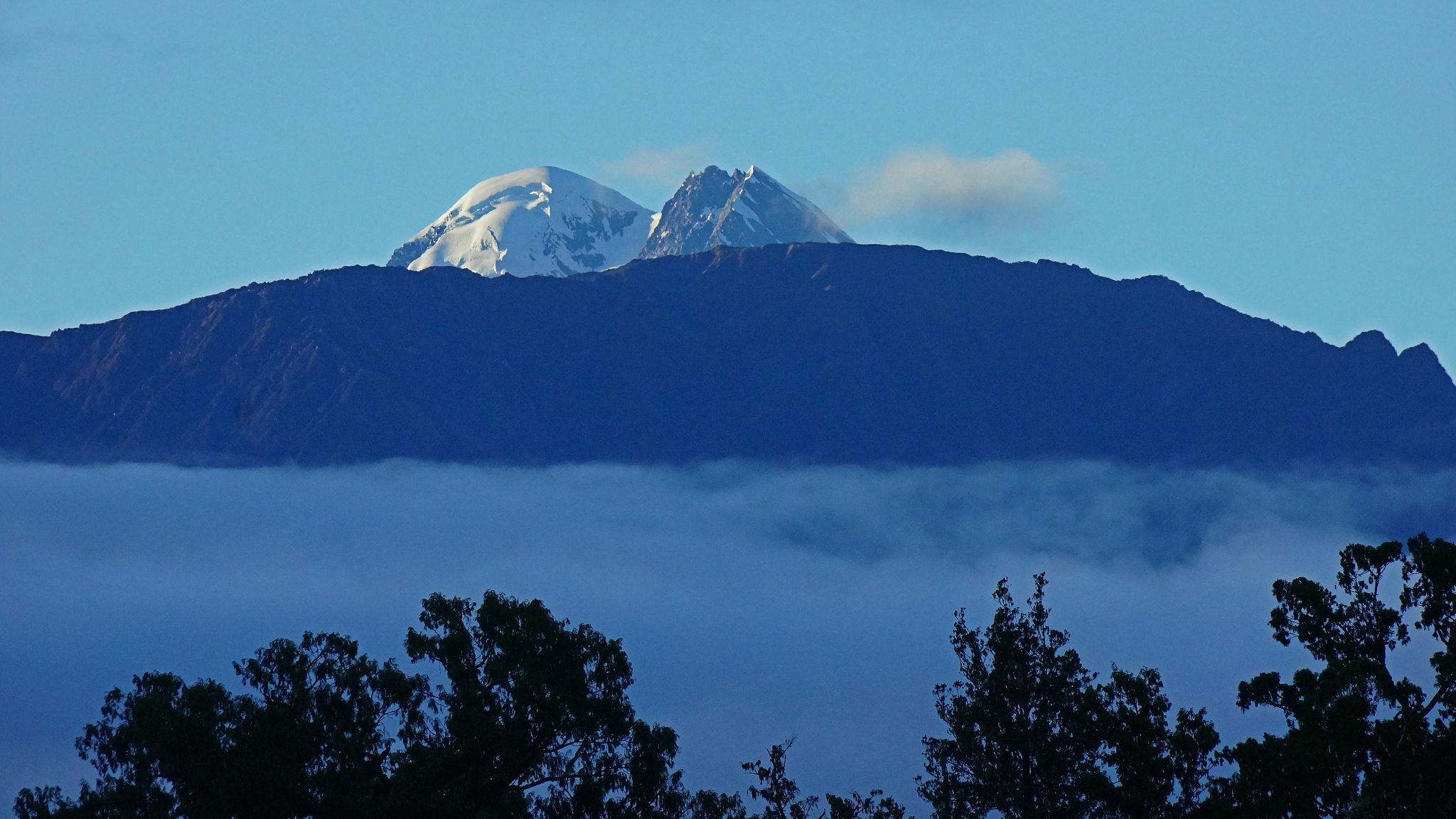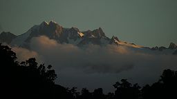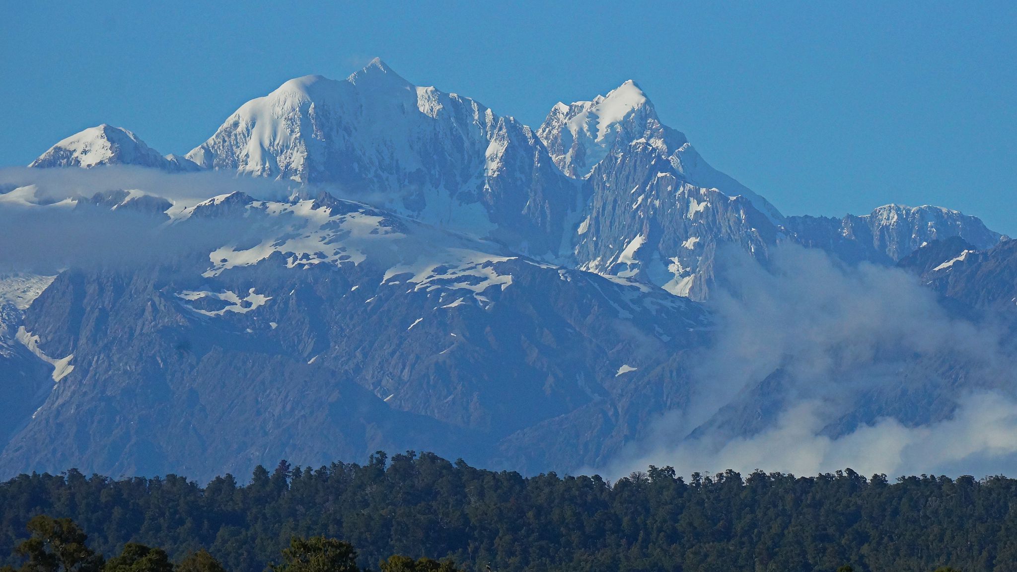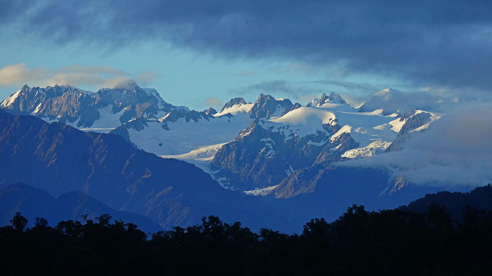 Lagoon: from kayak, pied oystercatcher, white heron, Alps.